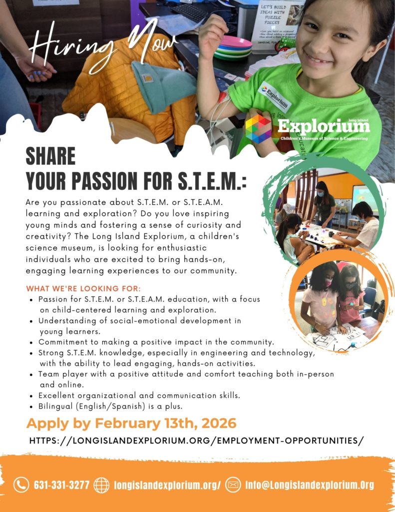 - Submit a cover letter and resume to jobs@longislandexplorium.org