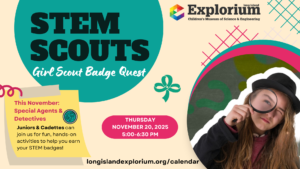 RegisterNovember 20, 2025 – GIRL SCOUTS – STEM SCOUTS Thursday, November 20th, 2025 Juniors & Cadettes Thursday, November 20, 2025 | 5:00 – 6:30 PM Long Island Explorium, Port Jefferson A thrilling STEM mystery adventure for curious Scouts! Who stole the cookies? Step into the shoes of a real detective and use logic, observation, and critical…
